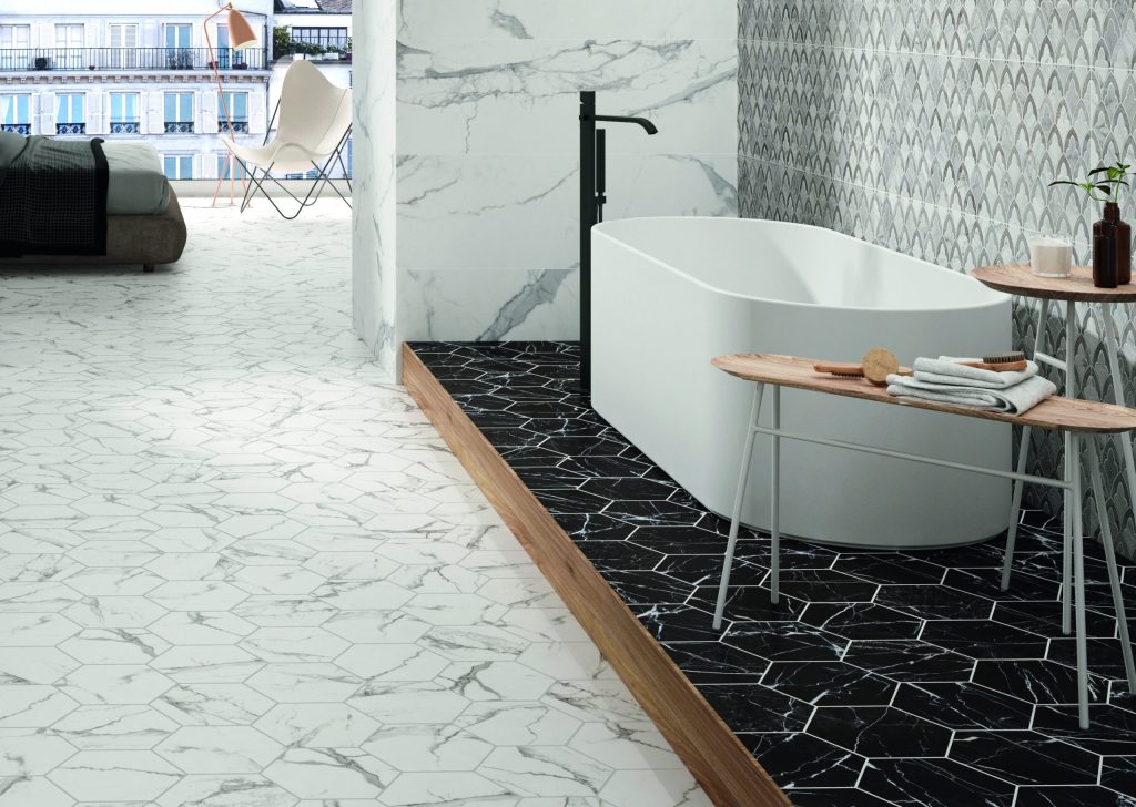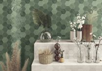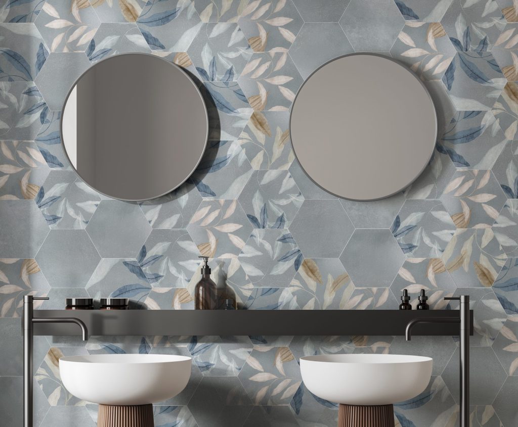 Pierwsza propozycja to płytki heksagony o geometrycznej wariacji – Realonda Malmoe 33×28,5. Stonowane kolory sprawiają, iż płytka nie jest aż tak bardzo przytłaczająca. Świetnie sprawdzi się zarówno na ścianach, jak i na podłogach. Geometryczny wzór sprawia, iż płytki wydają się być trójwymiarowe.