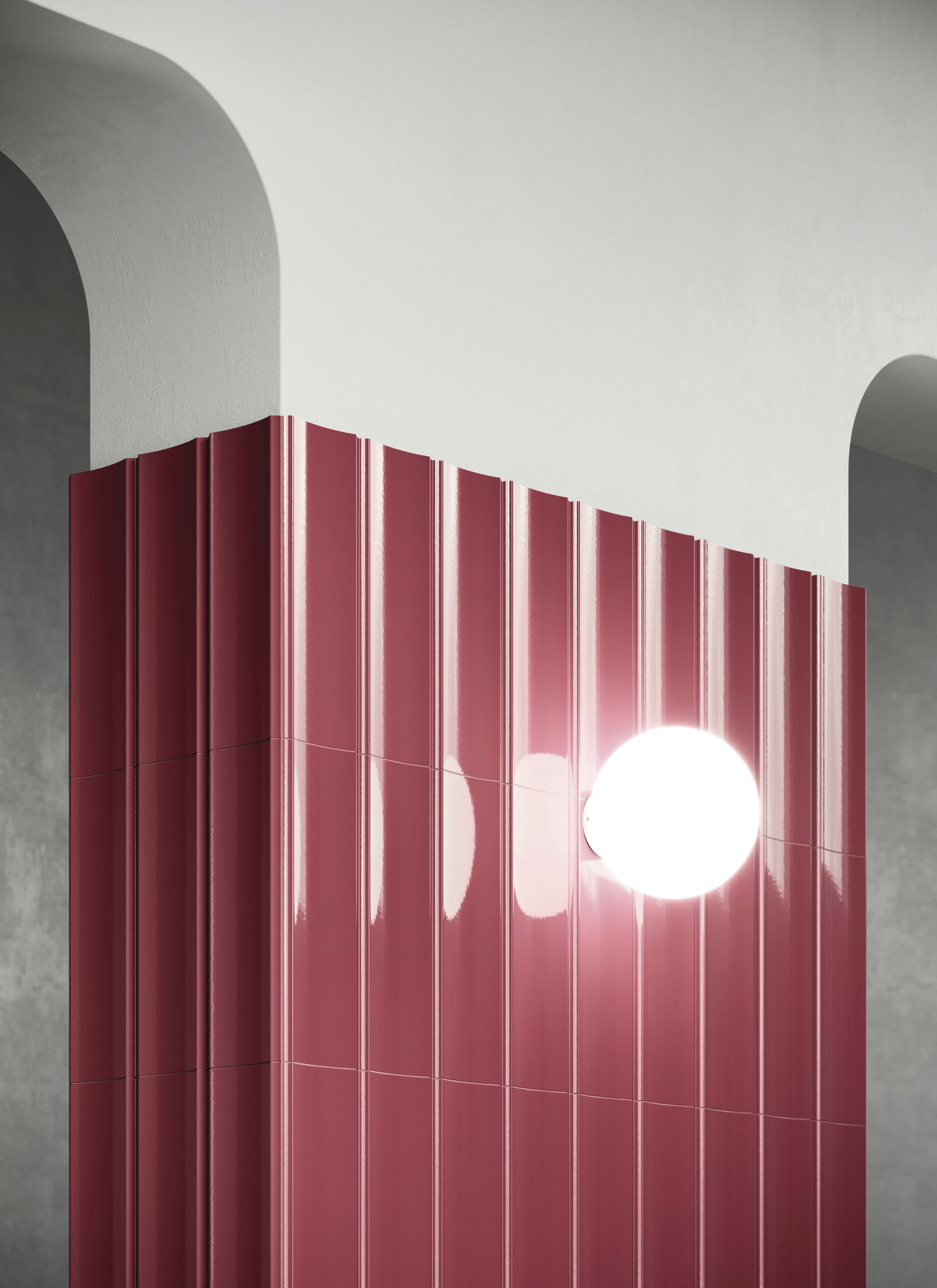 Harmony Bow Bordeaux płytka dekoracyjna 15×45 jest płytką ścienną, która charakteryzuje się wklęsłą strukturą. Kolekcja inspiruje się tradycyjnymi dachami śródziemnomorskich miast. Jest to nowe spojrzenie na tradycyjną dachówkę, która często pokrywa domy w małych, hiszpańskich miasteczkach. Kolekcja została stworzona przez studio projektowe MUT, które w 2010 roku zostało założone przez Alberto Sáncheza i Eduardo Villalóna. MUT charakteryzuje się tym, iż w każdy projekt wkłada mnóstwo wyobraźni i emocji. Dzięki temu tworzą niepowtarzalne projekty, od których nie łatwo odwrócić wzrok. Płytki Bow posiadają wykończenie błyszczące z wyjątkiem płytki Bow Clay, która jest matowa. Płytki można łączyć ze sobą na różne sposoby w celu dodania uzupełniającego akcentu dekoracyjnego.