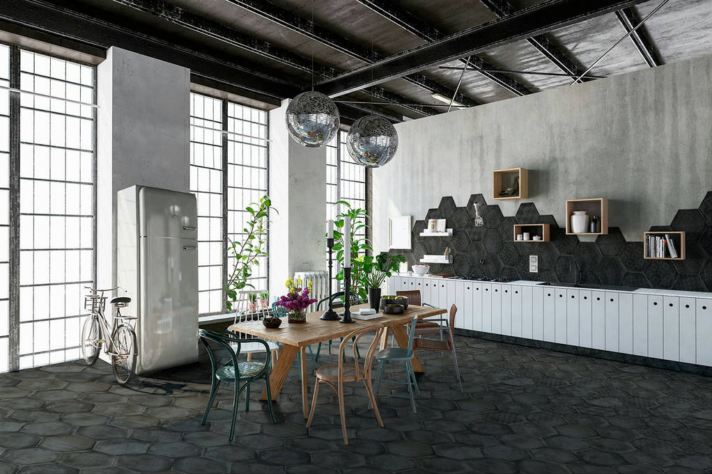 Keros Hexa Boreal Antracite 23×27 czarna płytka heksagon. Boreal to kolekcja płytek heksagonalnych utrzymanych w stonowanych kolorach, takich jak biel, beże, szarości i czerń. Seria oferuje zarówno płytki o gładkiej powierzchni, jak i i ciekawych wzorach klasycznych, a nawet geometrycznych. Jest to produkt, który zdecydowanie ma charakter dekoracyjny. Takie płytki możesz wykorzystać zarówno na ścianie, jak i na podłodze. Jeśli zdecydujesz się na wybór płytki mocno dekoracyjnej, polecamy wykorzystać ją na części aranżacji, ponieważ na całej aranżacji mogła by być przytłaczająca.