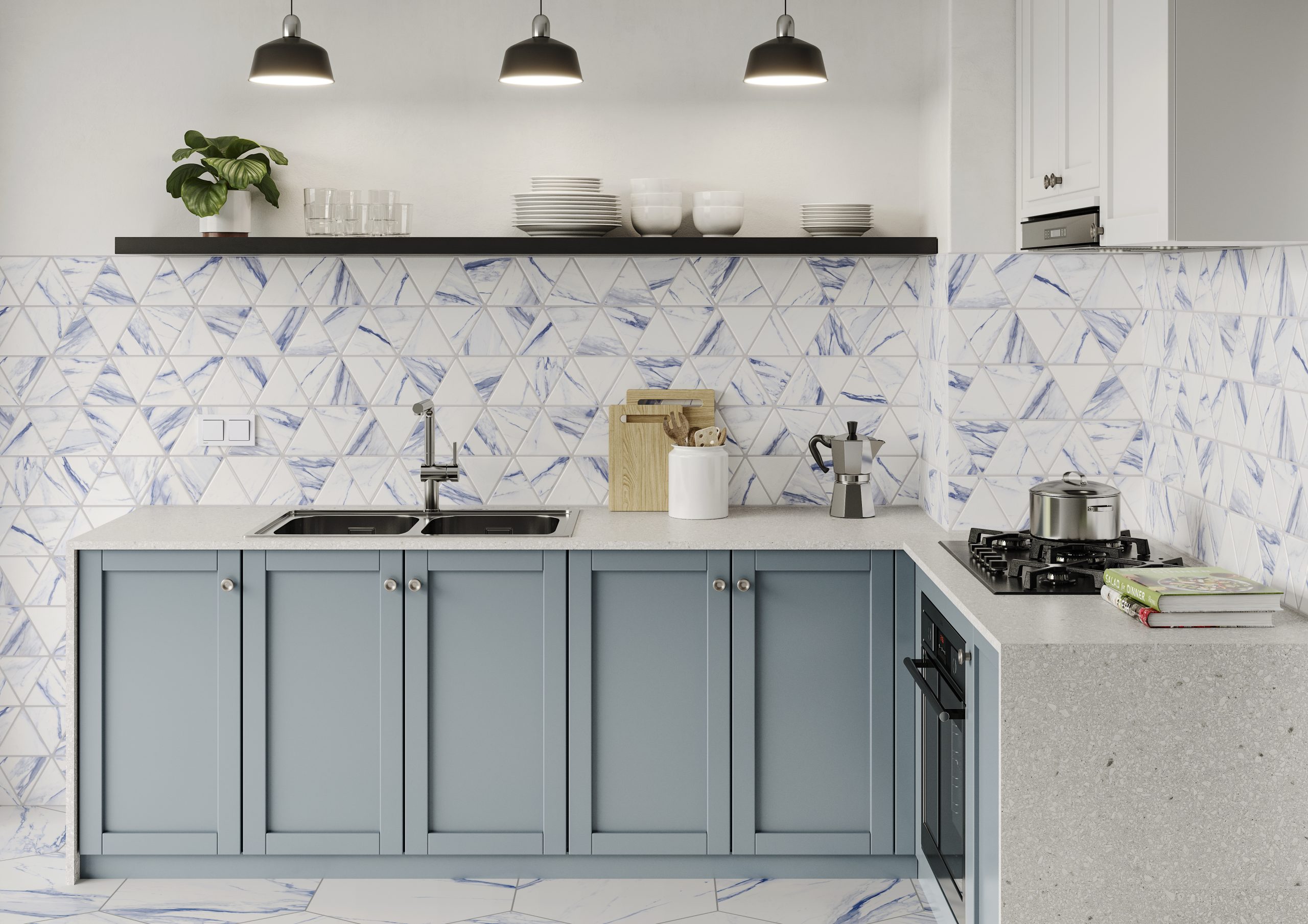 Realonda Triangle Thassos 48,5×28 płytka w trójkąty. Płytki Triangle to płytki stworzone z połączonych ze sobą trójkątów. Jest to niezwykle dekoracyjna kolekcja. Połączenie kształu trójkąta z wyrazistymi kolorami to sposób na oryginalne wnętrze. W serii znajdziemy płytki monochromatyczne o matowym wykończeniu a także płytki w kolorach zieleni i błękitu w wykończeniu połyskującym. Płytki z podziałem na trójkaty można wykorzystać zarówno na ścianach, jak i na podłogach. Seria Tariangle może być wykorzystana przykładowo w łazienkach pod prysznicem czy w kuchni, gdzie będzie wypełniac przestrzeń pomiędzy szafkami a blatem w kuchni.